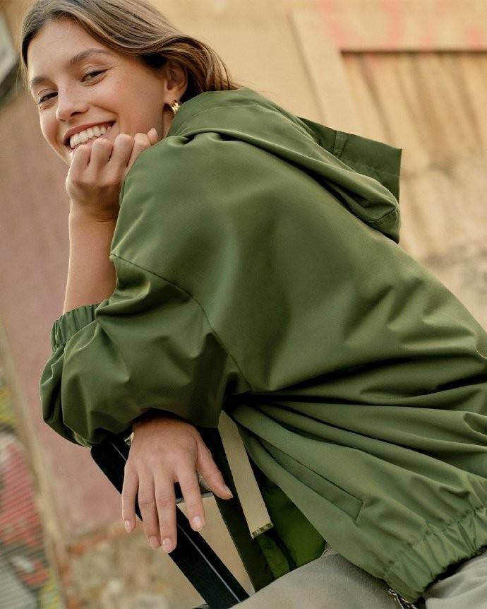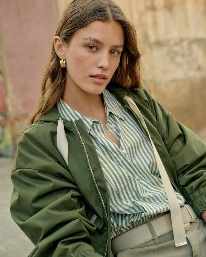 如果你对搭配感到迷茫,不妨选择一款彩色条纹衬衫,按照同色系搭配,打造出轻松慵懒的造型。比如 iBLUES 2024 春夏系列的绿色衬衫,轻柔贴身。乍暖还寒的春天,单穿还是挺凉的,把条纹衫当做内搭,叠搭同色系防风短外套,轻松应对多变天气。然后用鞋子去转换一下风格就可以了。