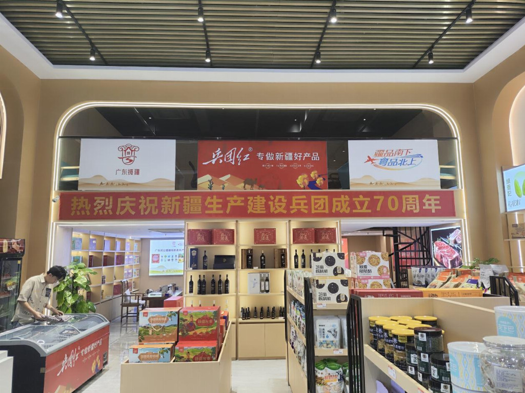 东莞馆位于东莞市南城区胜和广场A栋102铺,以“疆韵粤风”为主题,融合新疆民族元素与现代美学。这里不仅是新疆优质产品的展销平台,更是两地文化交融、产业协作的纽带,为东莞市民带来“舌尖上的新疆”与“丝路风情”的沉浸式体验。步入馆内,仿若置身喀什古城的“美食大巴扎”,独特的建筑风格、琳琅满目的农产品陈列与交互式体验区,让消费者瞬间穿越千里,感受西域的浓郁风情。