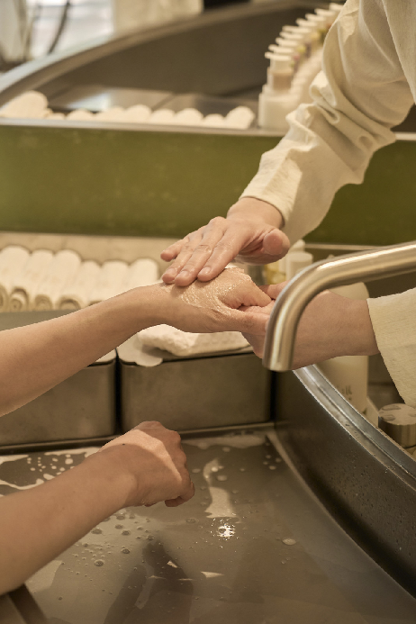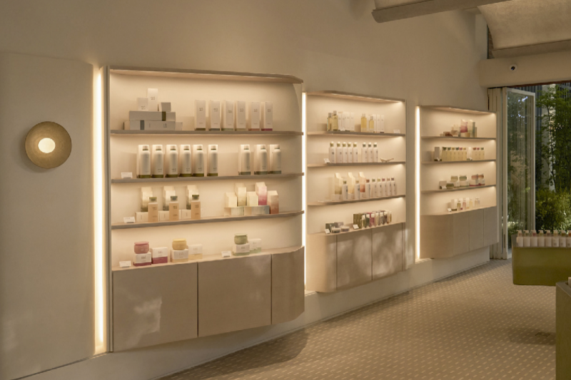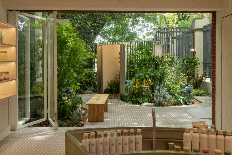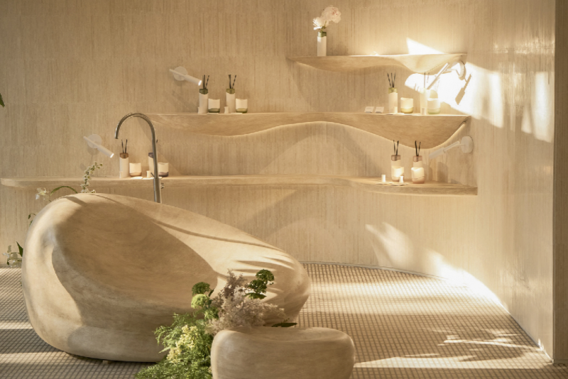 "我们不想让消费者在琳琅满目中迷失"品牌市场负责人刘骏翼表示,"通过渐进式感官引导,帮助用户先与香气产生情感联结,再自然过渡到产品体验。"chillmore宝庆路店内的产品展示前区以情绪舒展的空间香氛松散陈列为主,转身即可抵达居家和出行场景的香挂、香水和唇油展示区。随后大量的空间留白给到了反射宝庆路路牌的装饰镜面和休憩沙发,在门店最后区域才是chillmore最经典的身体和头发洗护产品的侧立陈列。展示伴随着巨大的定制产品体验洗手台,以及一个每天都有绵密泡沫的浴缸。在这里,已经临近门店内部与花园的交界点,稀疏的手工地砖与弧形天花板的末端连接到室外,让产品的体验和选择也变得心旷神怡。