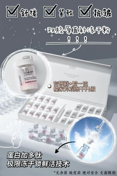 兮洛思舒缓紧致抗皱胶原套盒中的——舒缓紧致抗皱双萃冻干絮,是科技与美学的结合。它不仅是传统护肤品的升级版,更是采用了前沿的三型胶原纯胶原成型技术,保留了胶原蛋白的纯度。其独特的上层冻干絮下层冻干粉技术和设计,不仅让产品外观更加精致,更在使用过程中带来柔和舒适肤感与凝润度。在GMP车间进行急速冻干处理,配合医用级西林瓶无菌密封包装,确保了产品的无杂质与强安全性,让您在家就能享受到美容院级别的肌肤护理。