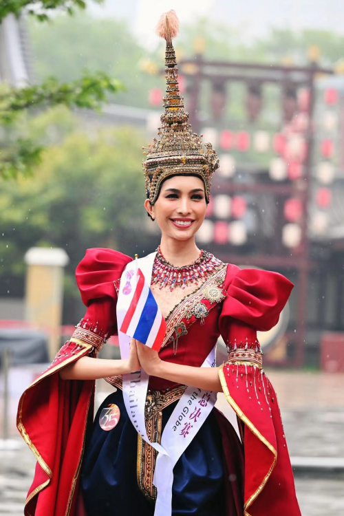 选手里个头儿最高的,是来自泰国的佳丽。她带来的国服华美贵气,行走时拖地的长裙摆容易褶皱。近旁的选手连忙帮她整理裙摆,纷纷称赞这条裙子“so beautiful”,她则用小礼物作为答谢。
