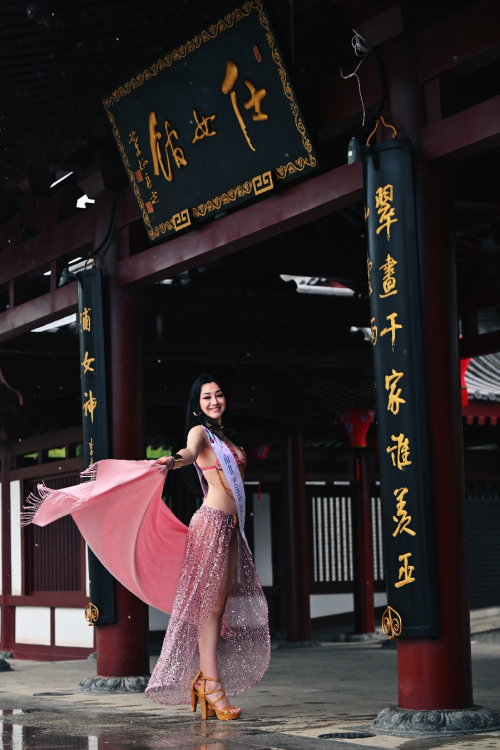 那个穿淡粉色珠光长裙的佳丽,来自南非。她的母亲是江苏人,父亲是南非人,所以她能自由的在中、英文两种语言间切换。她就像芙蓉园湖上的小桥,连接两边。每当看见选手间交流困难,她便主动化身翻译,不时地挑挑眉毛,嘴角扬起,露出富有成就感的神情。