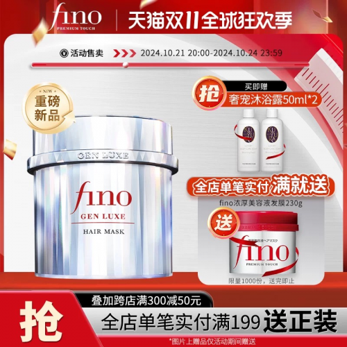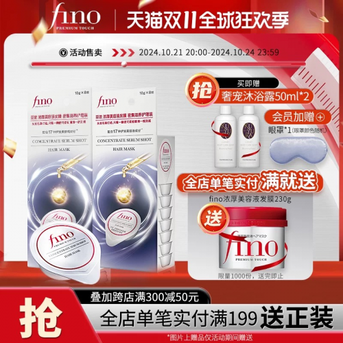 双11抢先购及狂欢节期间,购买1件装「银钻发膜」可获可悠然奢宠美肌沐浴露50mL*2。同时可叠加跨店满300-50元。全店单笔实付满199元前1000名,送正装「fino浓厚美容液发膜」230g。