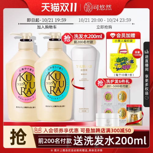 双11抢先购及狂欢节期间,前100名付款可获同款洗发水替换装400mL,前101-1500名付款加赠沐浴露90mL+身体霜18g,入会领券享优惠,可叠加跨店满300-50元。