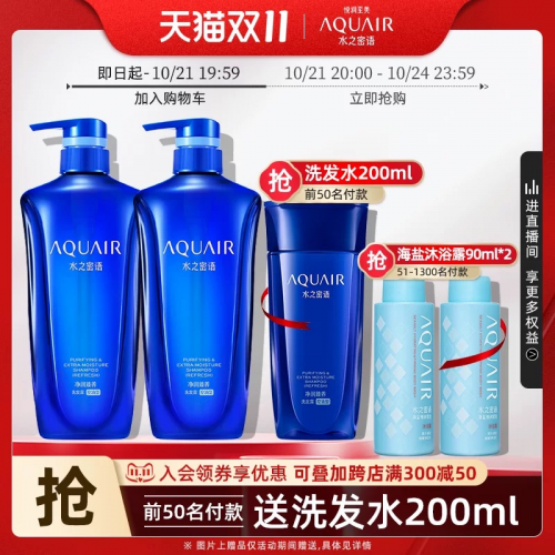 双11抢先购及狂欢节期间,前50名付款可获赠洗发水200mL,第51-1300名付款获赠海盐沐浴露90mL*2。