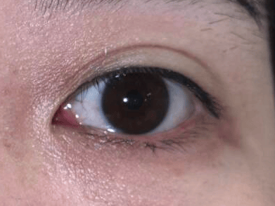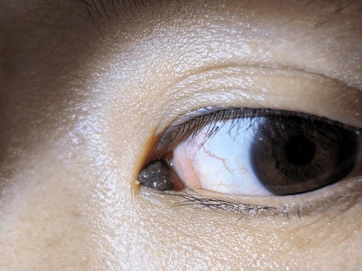 在肉眼观察下,我们清晰可见这颗肿物长在左眼内眼角,呈黑褐色,大小约为3*2mm,边界清楚且表面还附有毛发,但是基底部未能看清。